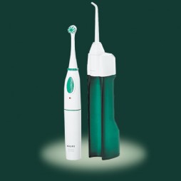 * Dual voltage electric toothbrush with a set of one brush and one nozzle for complete dental care program.